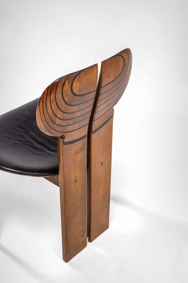 Legno di noce massello, intarsi in legno ebanizzato, sedile in compensato curvato rivestito in pelle.
