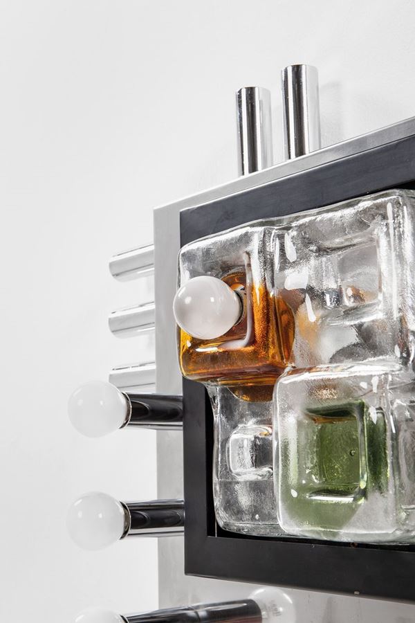 Metallo verniciato, metallo cromato, vetro stampato con inserti di colore.