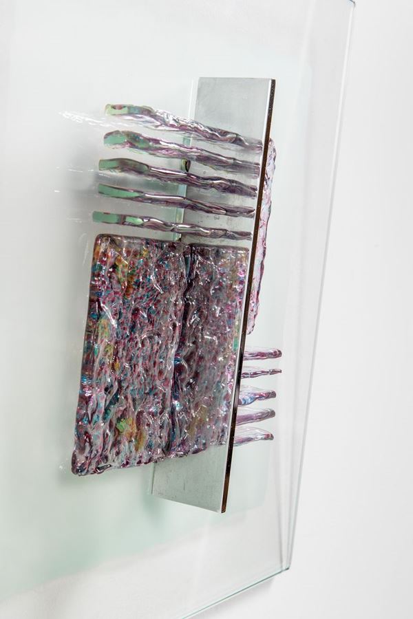 Cristallo molato parzialmente acidato, nastri in vetro trasparente con macchie di vetro colorato, metallo cromato.