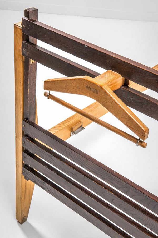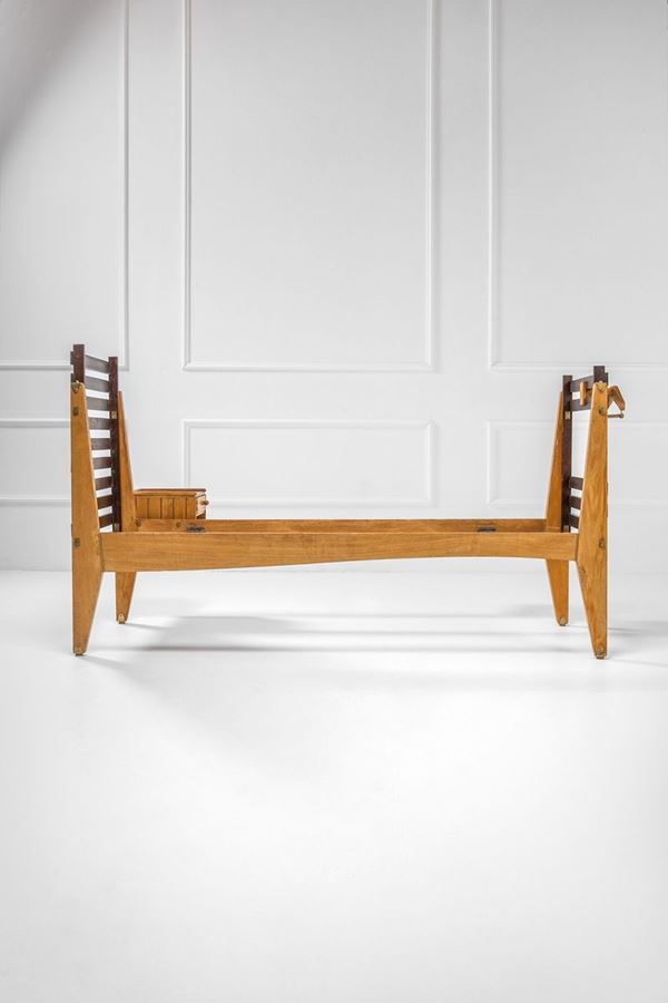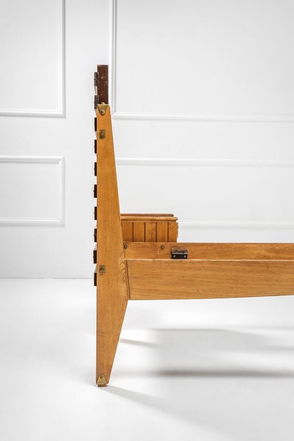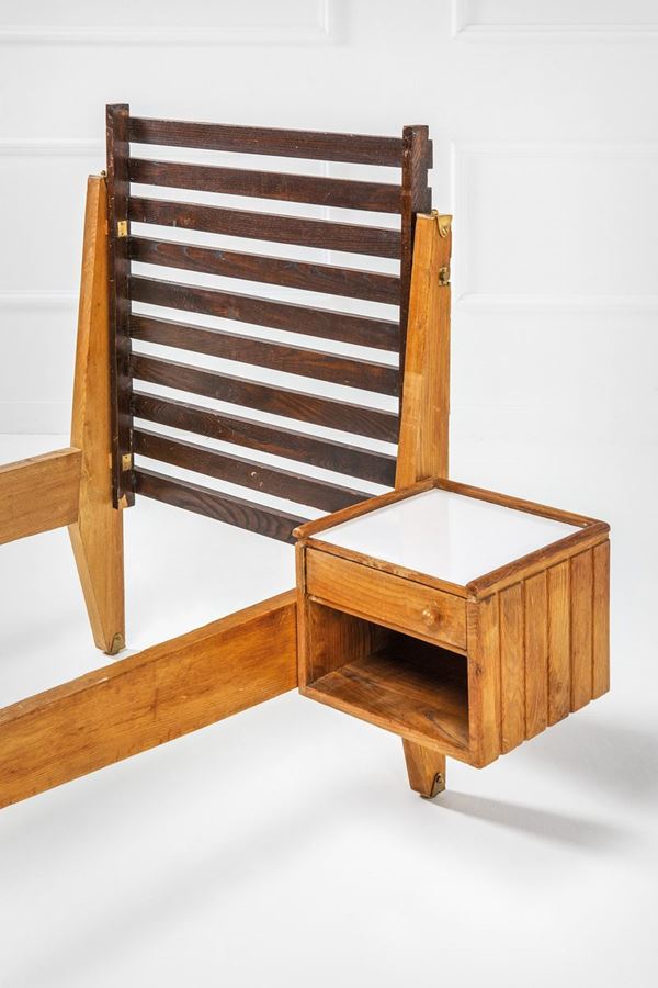 Letto con appendiabiti scorrevole e comodino sospeso e mensola a sbalzo proveniente dalla Casa del Sole di Cervinia.