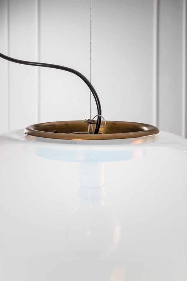 Vetro lattimo lievemente iridato, metallo ottonato.