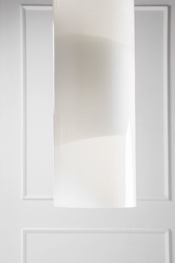 Vetro trasparente con fascia di vetro lattimo, metallo ottonato.