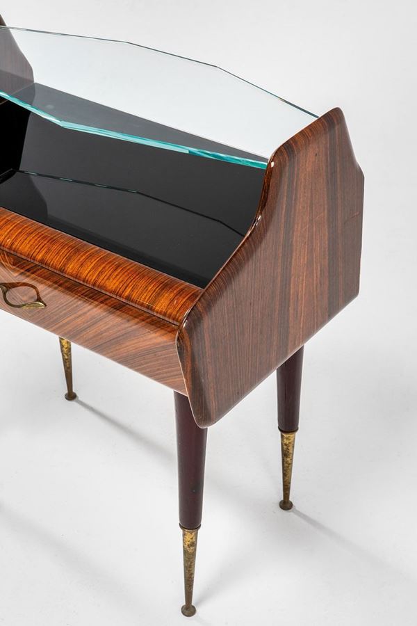 Legno impiallacciato in palissandro, legno tinto, ottone, vetro.