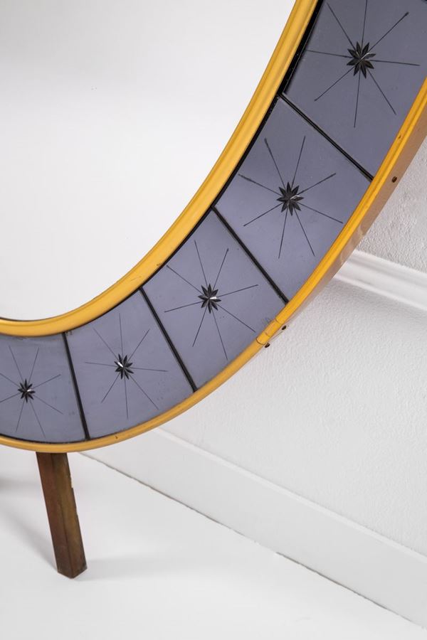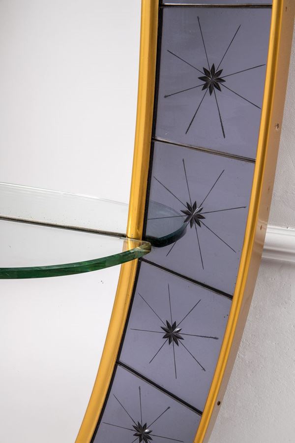 Cristallo colorato, molato e specchiato, ottone; mensola in cristallo molato.