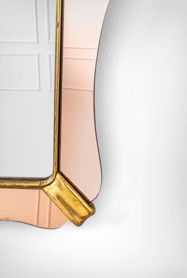 Vetro con specchiatura rosa, vetro specchiato, legno dorato.