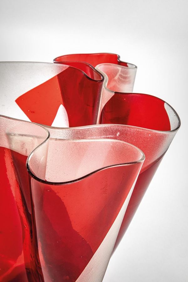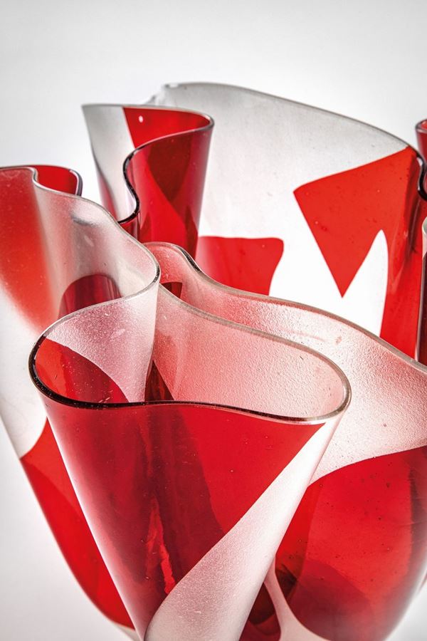 Foglio di cristallo lavorato a caldo con decoro rosso sabbiato.