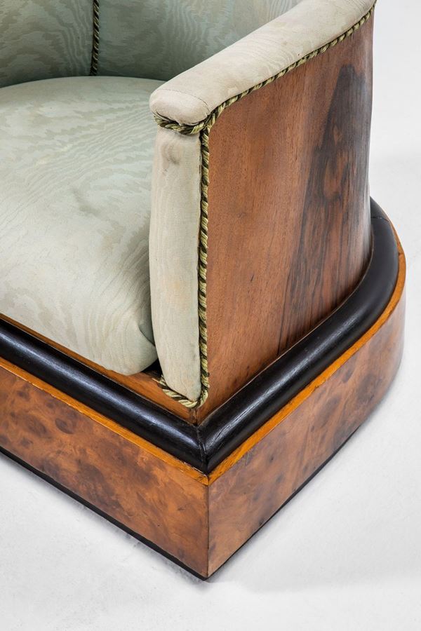 Legno lastronato in radica, legno ebanizzato, tessuto.
