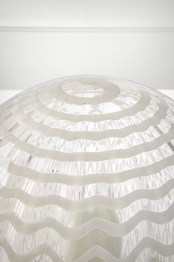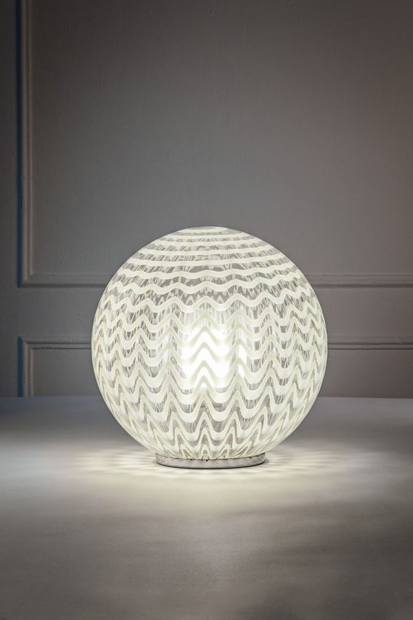 Metallo cromato, vetro soffiato di Murano incolore con decorazione lattimo.