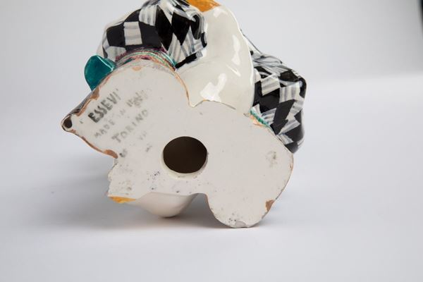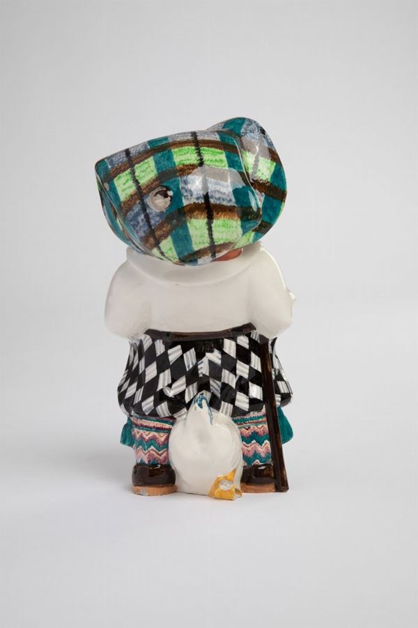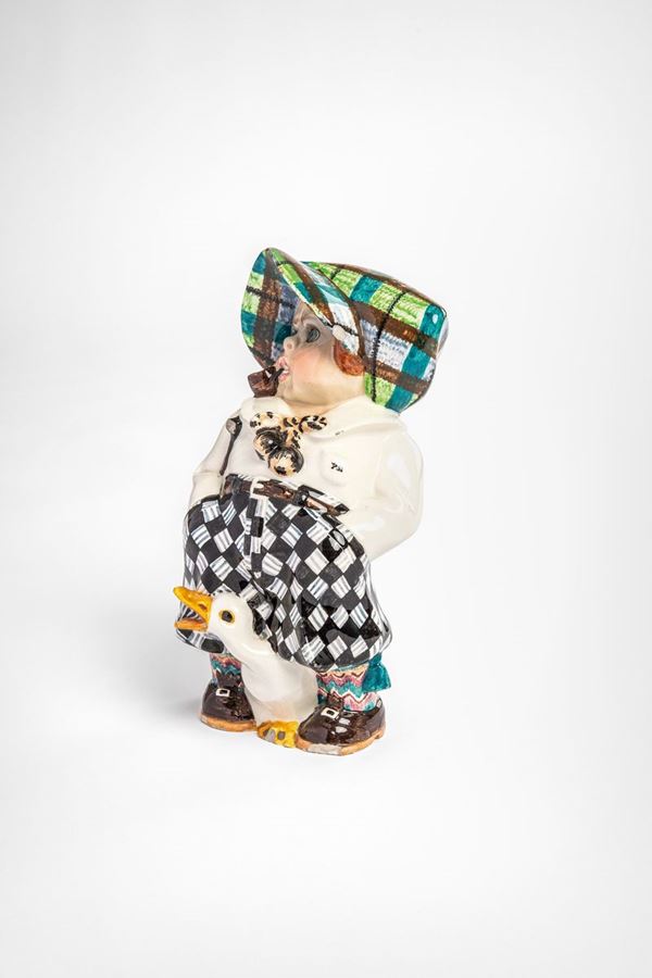 GolfistaStatuina in ceramica modellata a colaggio e smaltata in policromia sotto vernice raffigurante bimbo con mazza da golf, pipa e un’oca tra le gambe.Prod. ESSEVI, Torino, 1930 ca.Marcato al retro Essevì Made in Italy Torino