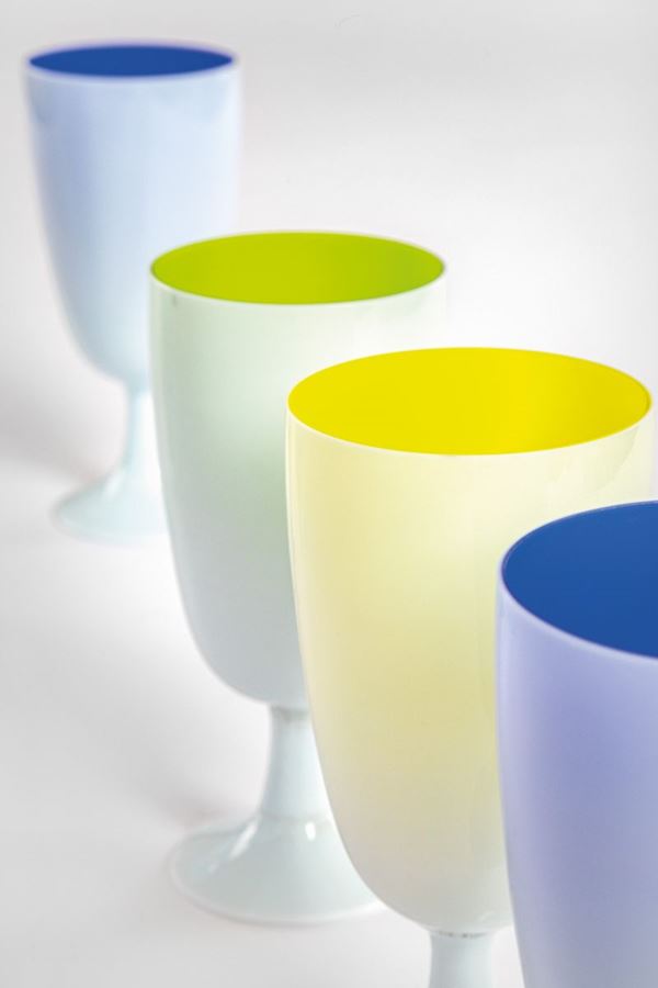 Vetro incamiciato con superficie satinata lattimo e interno in vari colori.