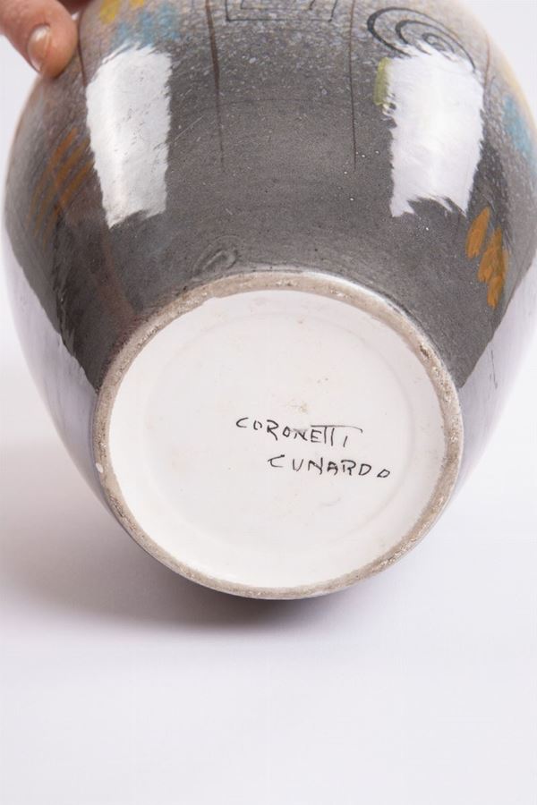 VasoCeramica policroma decorato con riquadri e simboli grafici.Prod. Coronetti, Cunardo, 1950 ca.Firmato sotto la base Coronetti Cunardo.