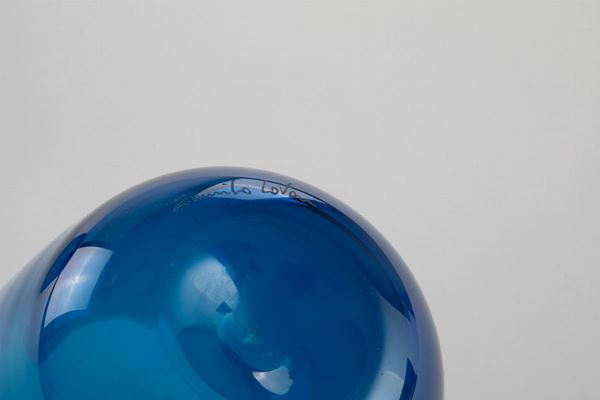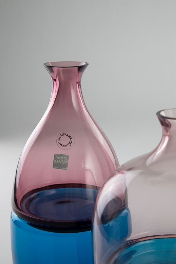 Tre bottiglieVetro soffiato rosa e acquamare.Prod. V. Nason & C., anni '80Etichetta V. Nason & C. ed etichetta Enrico Coveri.Firma incisa a punta Enrico Coveri.