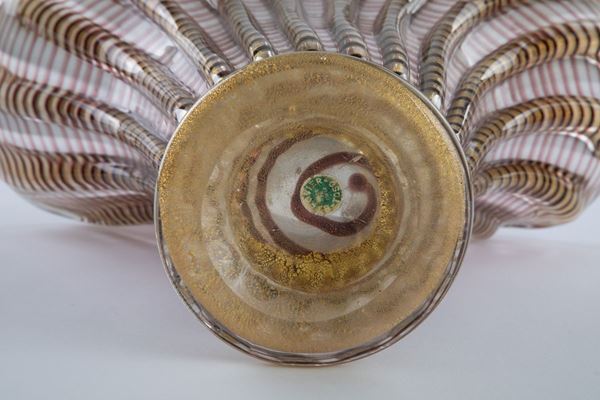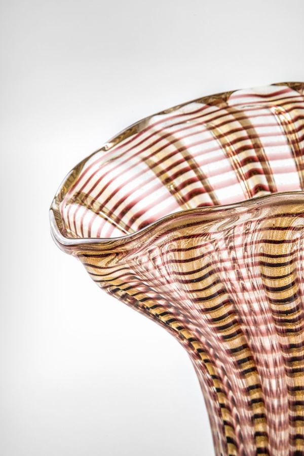 Vaso della serie ZebratiVetro soffiato in cristallo e oro con coste verticali e sottili spirali ametista.Barovier & Toso, 1949Etichetta Barovier & Toso