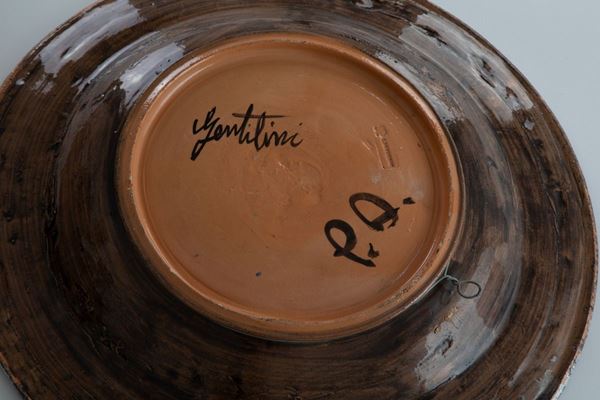 Grande piattoCeramica decorata in policromia con volto femminile.Prod. G. Rossicone, 1970 ca.Firmato al retro Gentilini P.A. e marchio impresso Rossicone