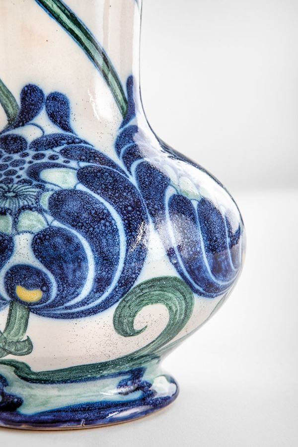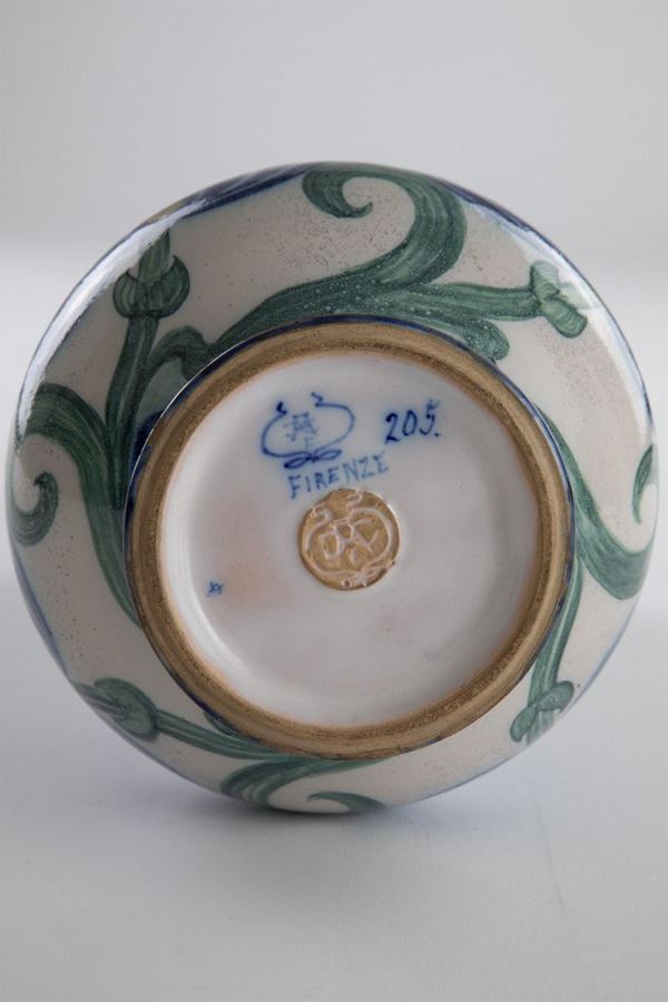 VasoMaiolica dipinta con motivi floreali blu e verdi su fondo bianco.Prod. Fornaci S. Lorenzo, Galileo Chini, 1910 ca.Marchio impresso nella pasta e in blu simbolo grafico della manifattura e numerazione 205.