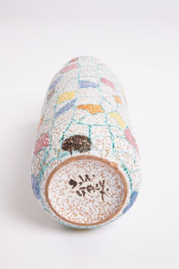 Grande vasoCeramica invetriata e decorata in policromia con elementi geometrici.Italia, 1950 ca.Marchio della manifattura sotto la base.