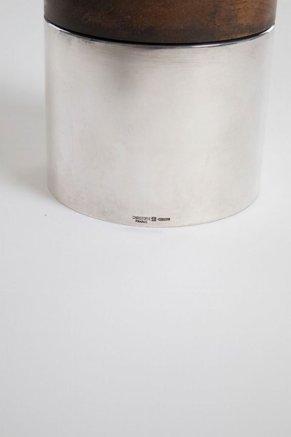 Portacandela cilindrico MontparnasseMetallo argentato, plexiglass e legno.Prod. Christofle – Collection Gallia, 1960 ca.Modello incluso nel catalogo Christofle anni ’60 e riconducibile alla serie “Manhattan” disegnata nel 1960.