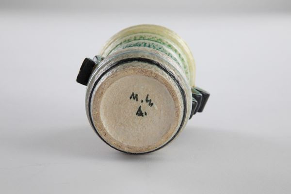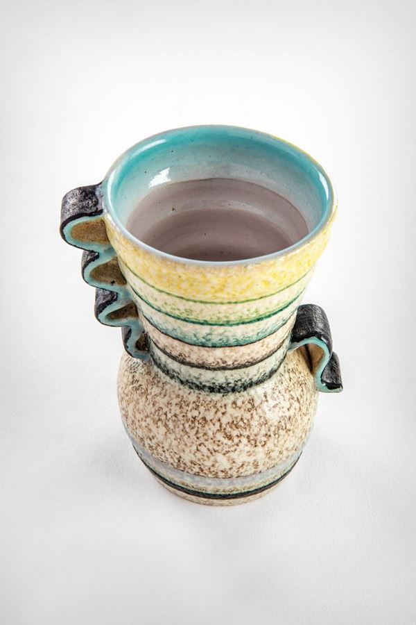 Vaso futurista con manici ondulatiCeramica mat decorata all'aerografo con smalti policromi.Prod. M.G.A., 1930 ca.Marcato sotto la base M.G.A.
