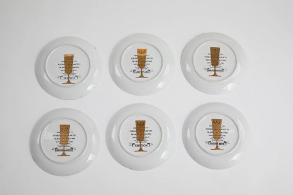 Dodici piatti serie Martini & RossiPorcellana bianca con decoro serigrafato.Prod. Fornasetti, 1950 ca.Marchio Fornasetti Milano serie per la Martini & Rossi