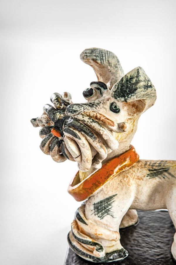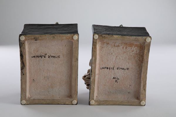 Coppia di cani fermalibriTerracotta maiolicata mat modellata a colaggio e dipinta a mano in policromia.Prod. M.G.A., 1930 ca.Marcati sotto la base M.G.A. importé d'Italie