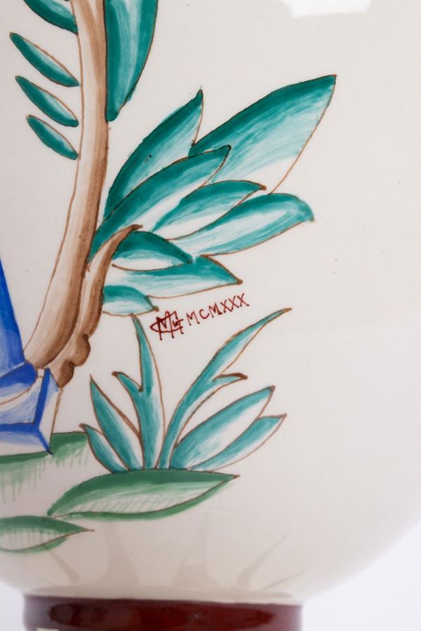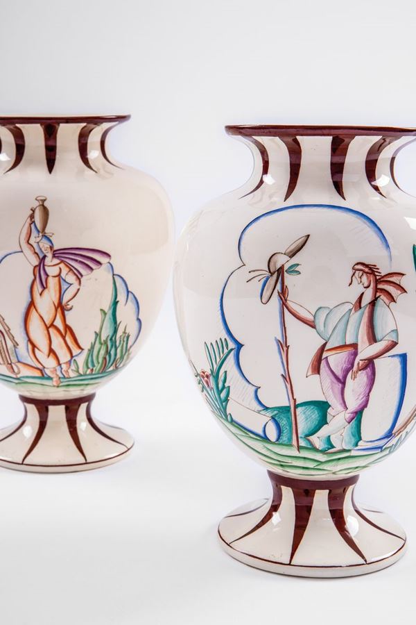 Due vasiCeramica bianca formata a colaggio e decorata a smalti policromi raffiguranti paesaggi con figure.Prod. Società Ceramica Italiana Laveno, 1930