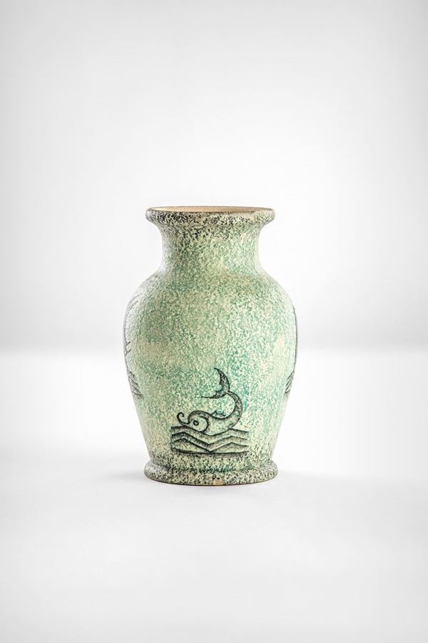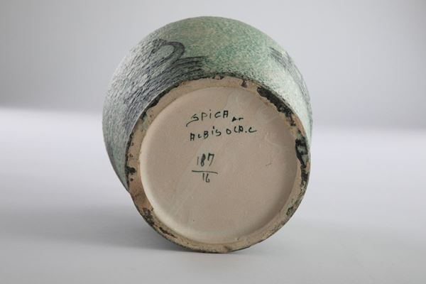 VasoTerracotta maiolicata mat modellata al tornio e decorata con barche e pesci stilizzati.Prod. Spica, Albisola, 1930 ca.Marcato e numerato sotto la base SPICA Albisola 187/16.