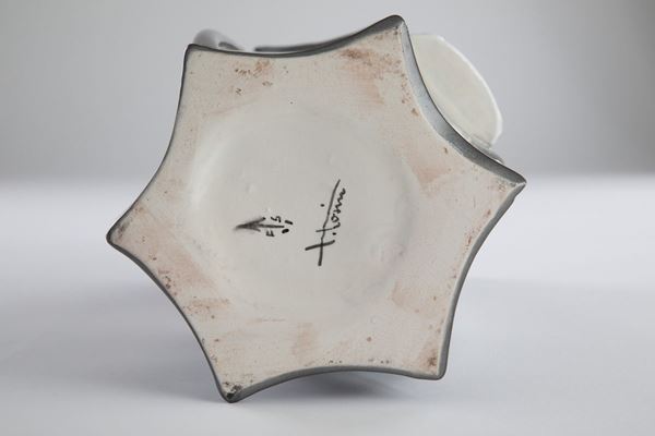 Cista a prisma con due nudini femminili applicatiCeramica.Prod. Tosin, 1928Marcato e firmato sotto la base.