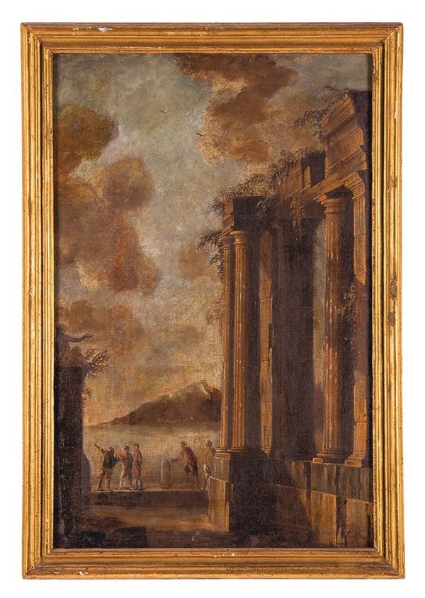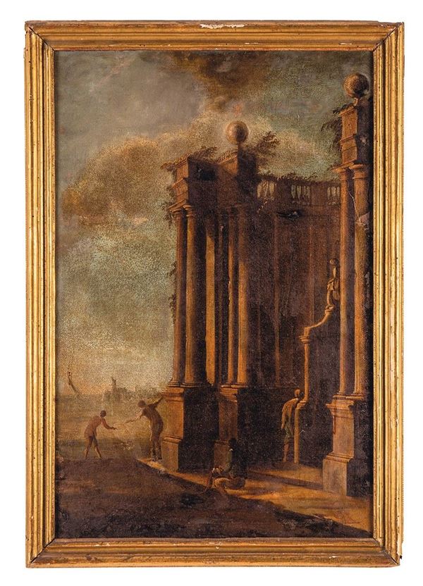 Due dipinti con architetture classiche e figurine