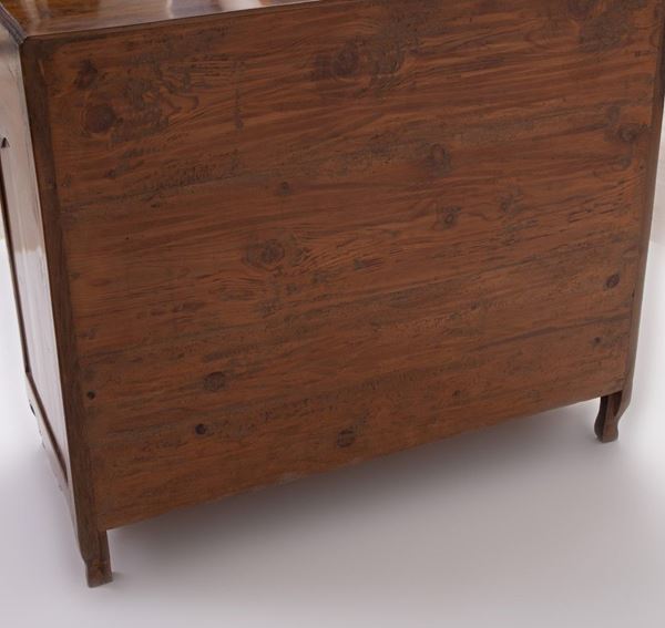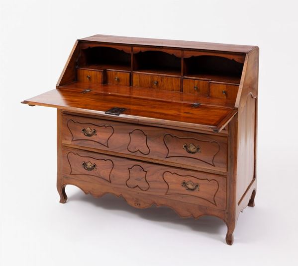 Comò a ribalta, fronte a tre cassetti di cui uno piccolo sotto la calatoia, decorato con formelle scolpite.
