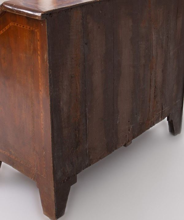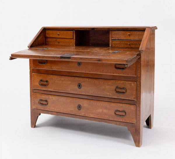 Comò con ribalta in noce filettato in legno chiaro a tre cassetti, ribalta con all'interno tiretti e vani a giorno.