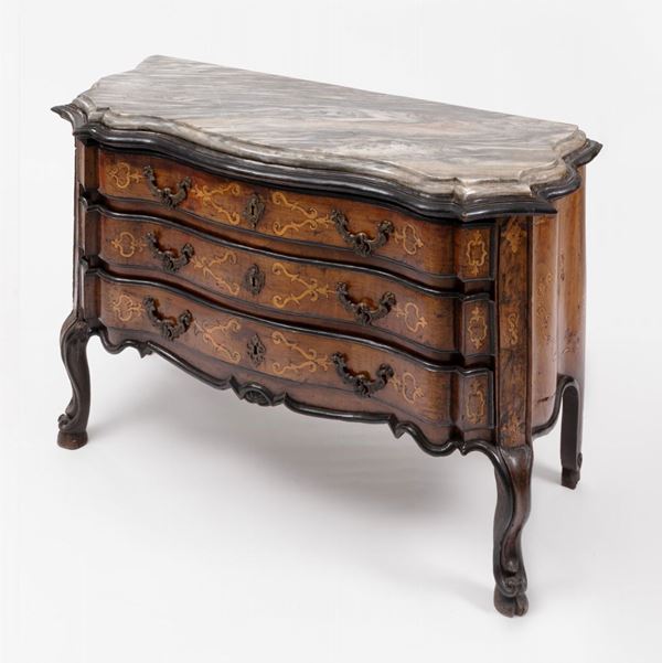 Raro comò in noce di linea mossa sul davanti e sui fianchi, intarsi a volute in legno di bosso sui cassetti e sui montanti. Piano in marmo. Gambe arcuate.