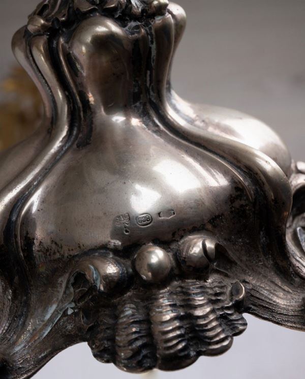 Coppia di candelieri in agento sbalzato a cinque luci.