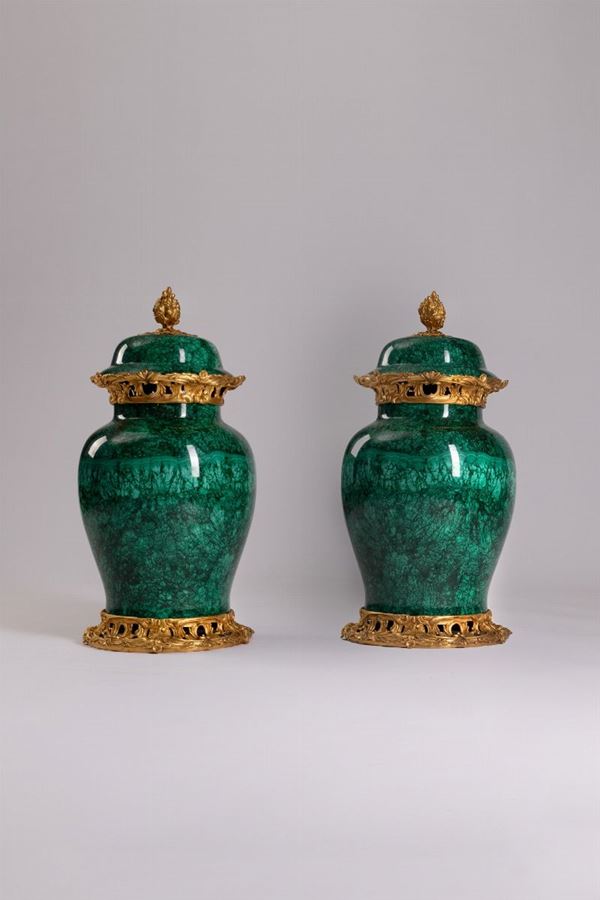 Due grandi potiches con coperchio in malachite montate in bronzo cesellato e dorato.