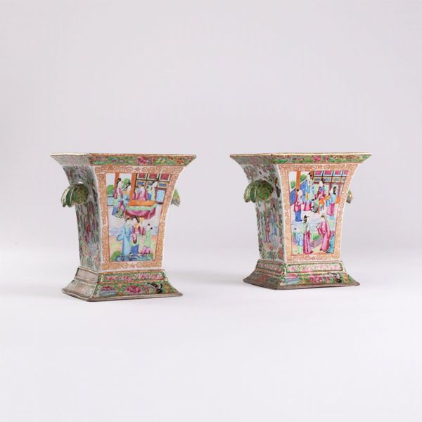 Due vasi in porcellana policroma, riserve dipinte a scene di vita cinese.