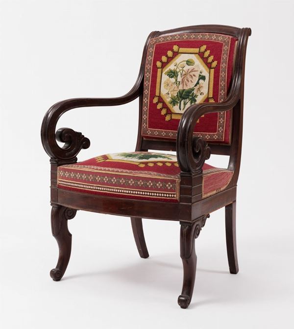 Struttura in mogano, copertura a piccolo e grosso punto.