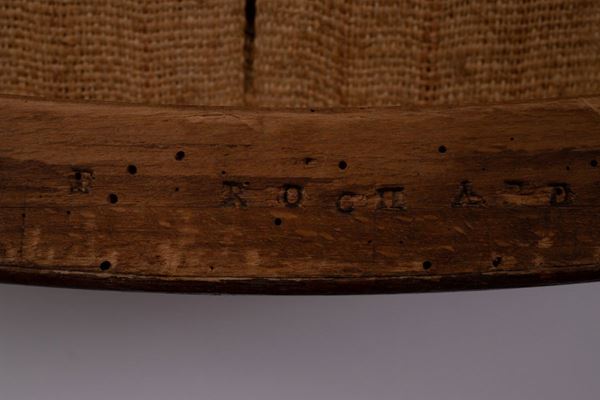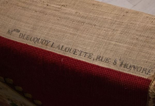 Stampigliato Rochard, illustre ebanista di Parigi. Il salotto risale alla prima metà del XIX secolo ed è ricoperto in piccolo e grosso punto a fiori d'epoca. E' appartenuto a Maria Letizia Bonaparte, duchessa di Aosta (Parigi 1866- Moncalieri 1926).