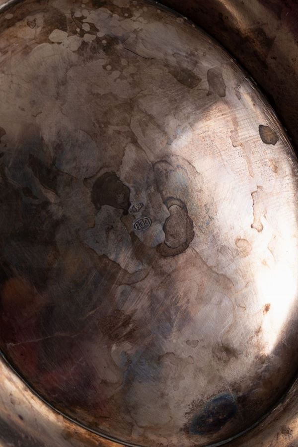Grande cestino in argento liscio, bordi frastagliati e traforati.