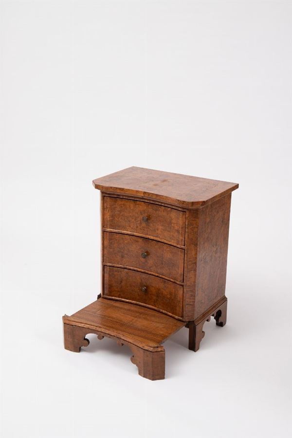 Mobiletto in radica, fronte a tre cassetti, parte inferiore estraibile a guisa di inginocchiatoio.