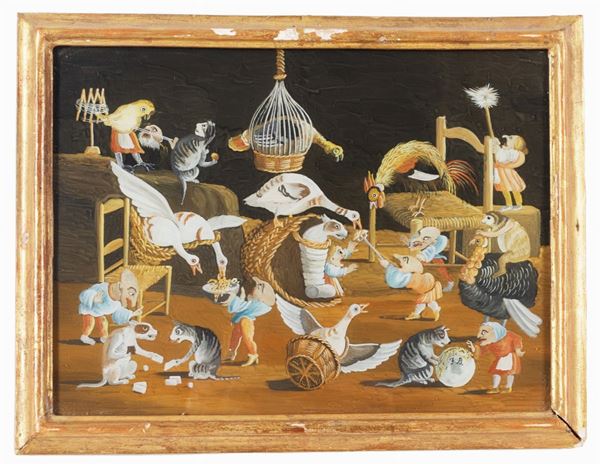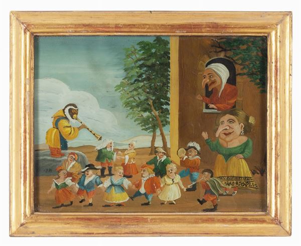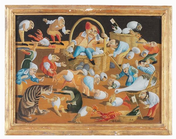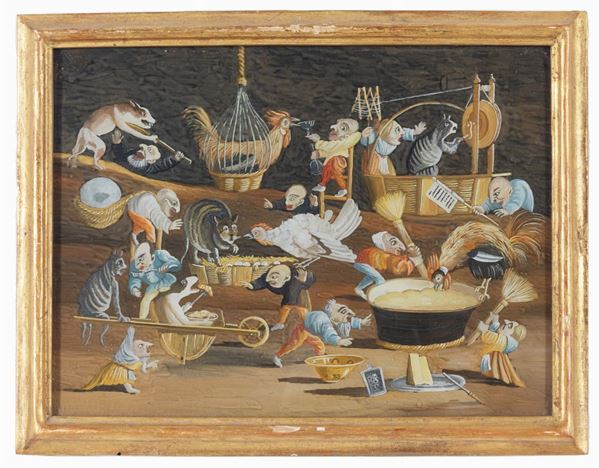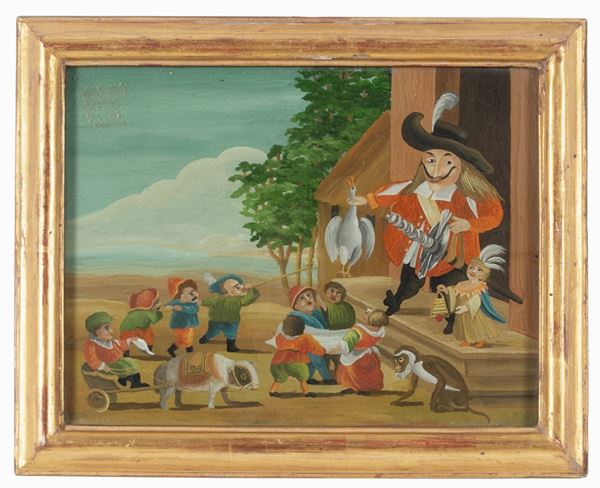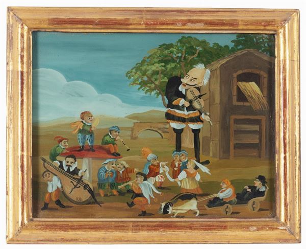 Sei quadretti dipinti sotto vetro a scene grottesche d'ispirazione fiamminga.