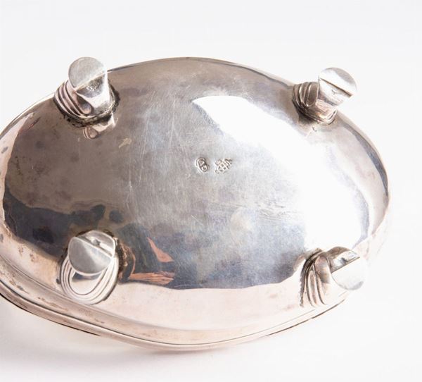 Zuccheriera in argento di forma ovale, corpo liscio sagomato, coperchio cimato da una ghianda.