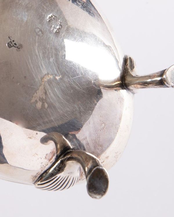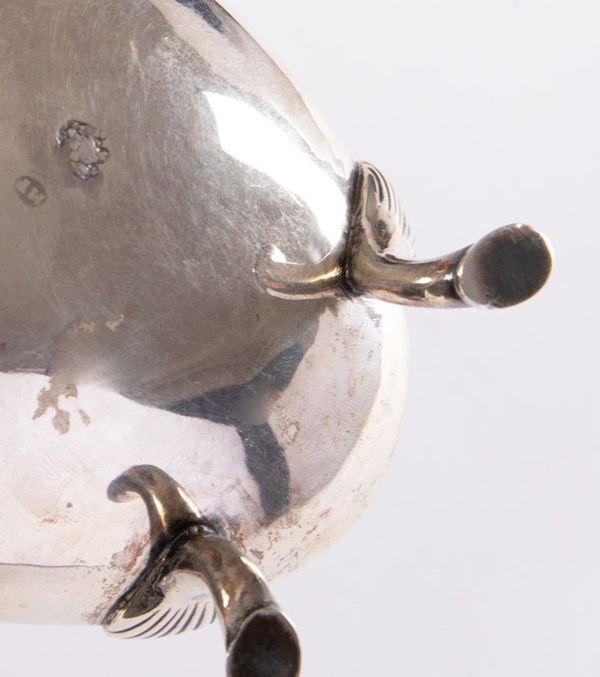 Zuccheriera in argento di forma ovale, corpo liscio, coperchio cimato da una rosa.