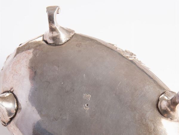 Zuccheriera in argento di forma ovale, corpo liscio sagomato, coperchio cimato da una rosa.
