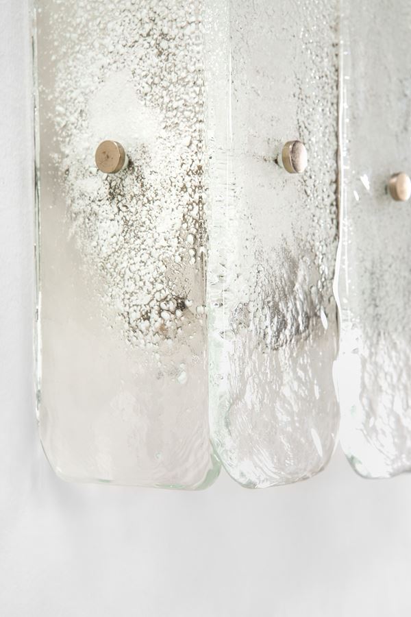 Vetro trasparente lavorato a caldo con inclusioni di vetro lattimo, metallo nichelato.
