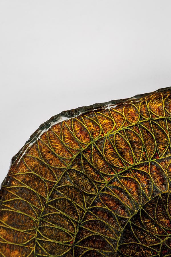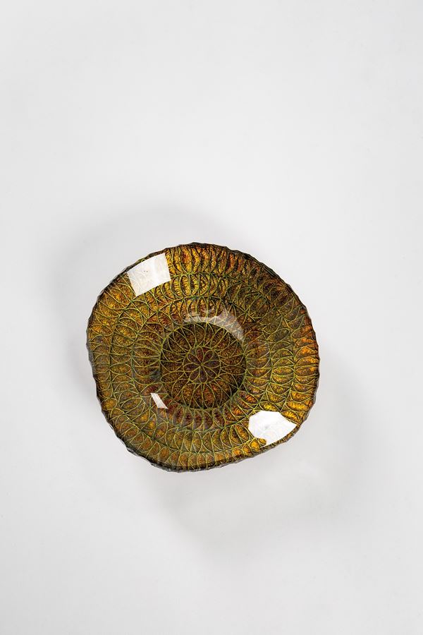 Cristallo curvato e molato con decorazione incisa all'acido.