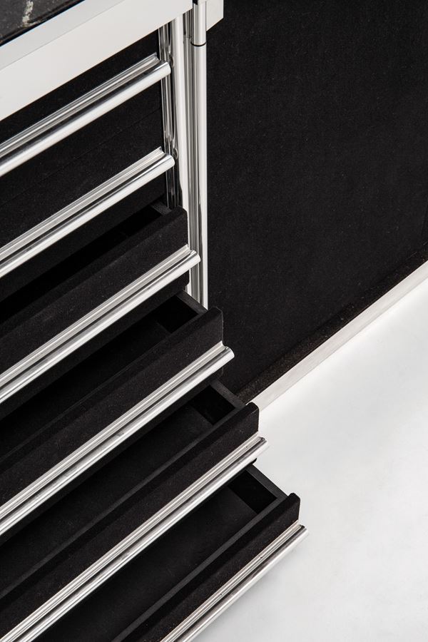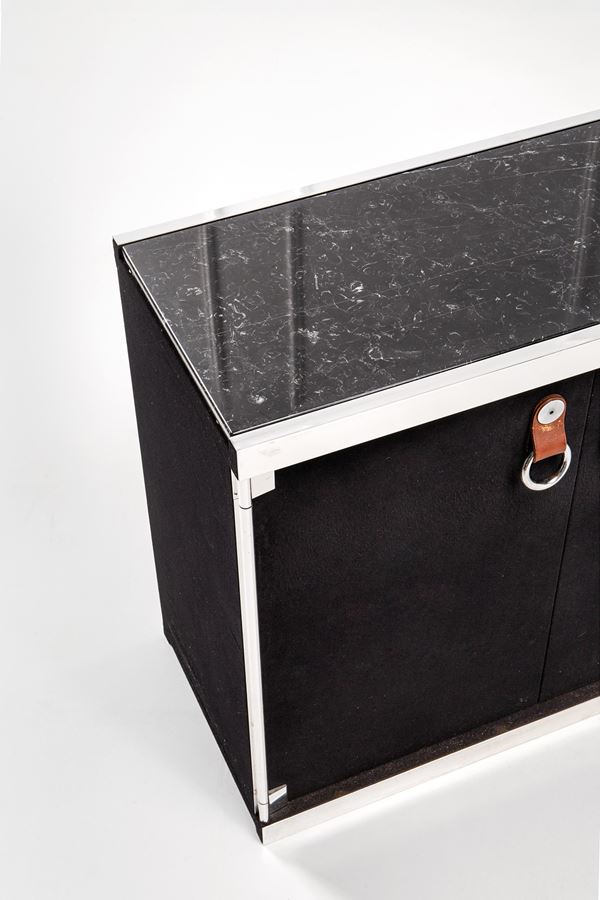 Legno laccato, metallo cromato, cuoio, tessuto, marmo.