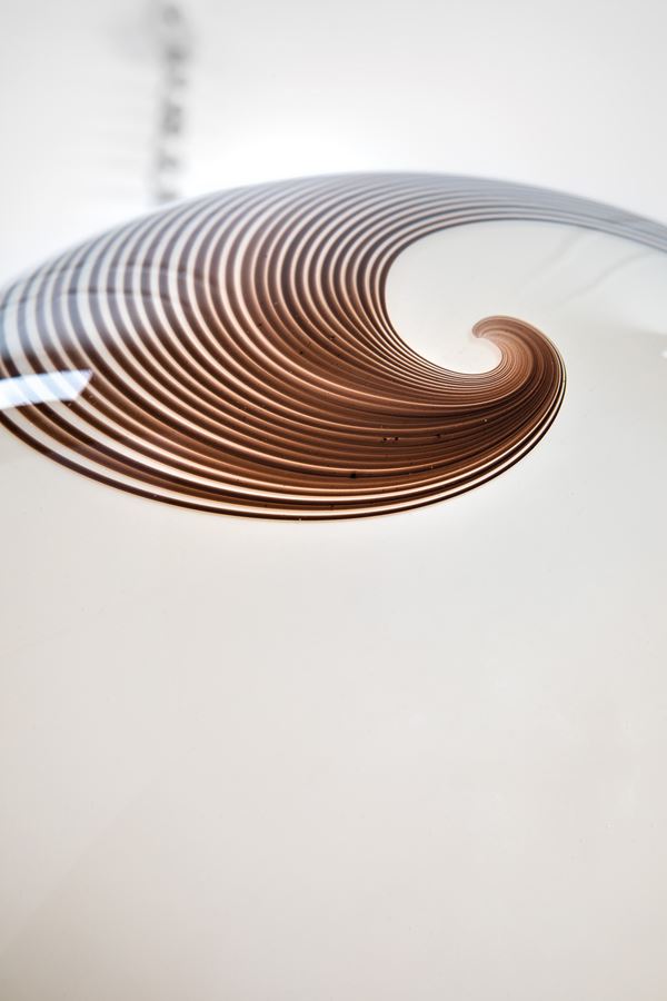 Vetro lattimo con decorazione a fili a spirale marroni, ottone.