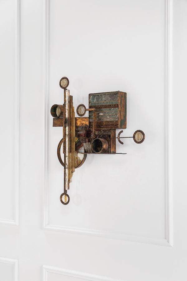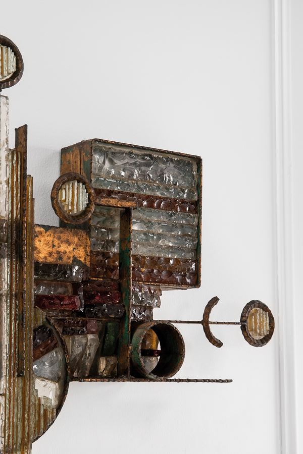 Metallo forgiato, vetro colorato di forte spessore.