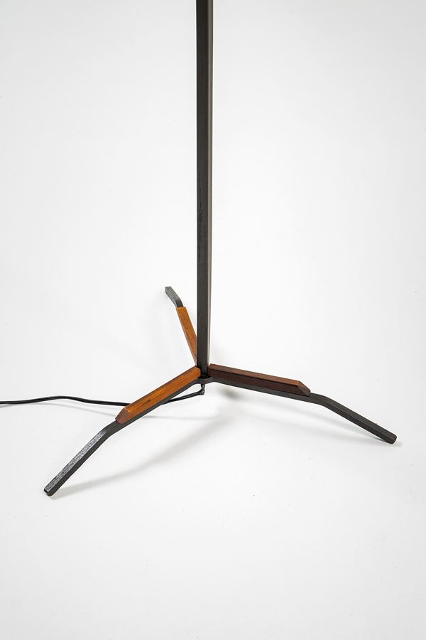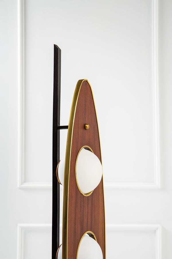 Legno di teak, metallo verniciato, ottone, vetro opalino satinato.
