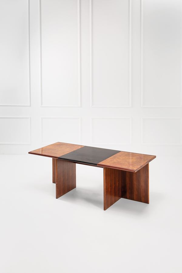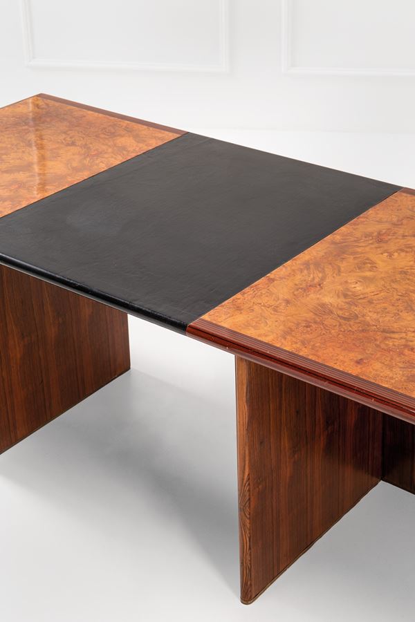 Multistrato impiallacciato in noce, palissandro e radica, cuoio.