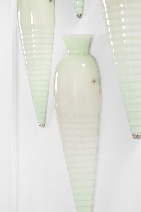 Vetro colorato incaminciato sagomato, metallo verniciato.
